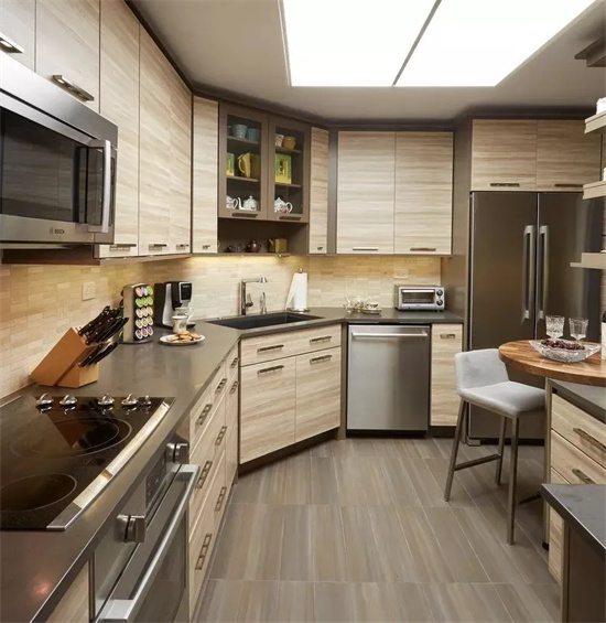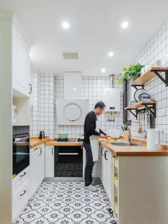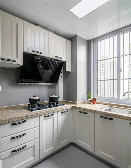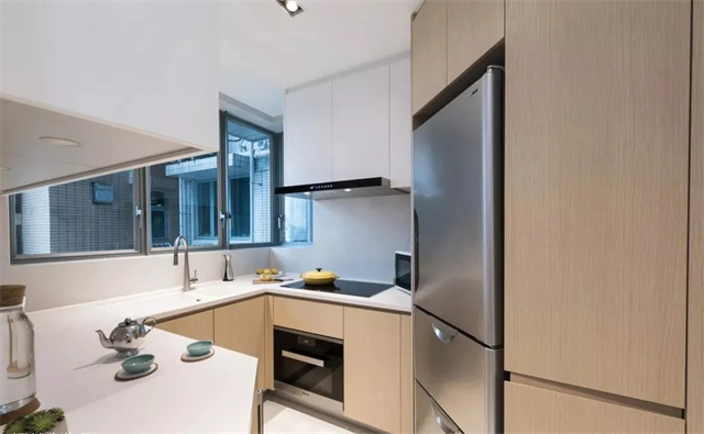 有些厨房规格偏长,长方形设计的厨房可以设计成“L”型,这样设计空间利用率更高,方便加装橱柜,增加储物空间。也方便动线设计,让整个厨房操作流程更顺手。