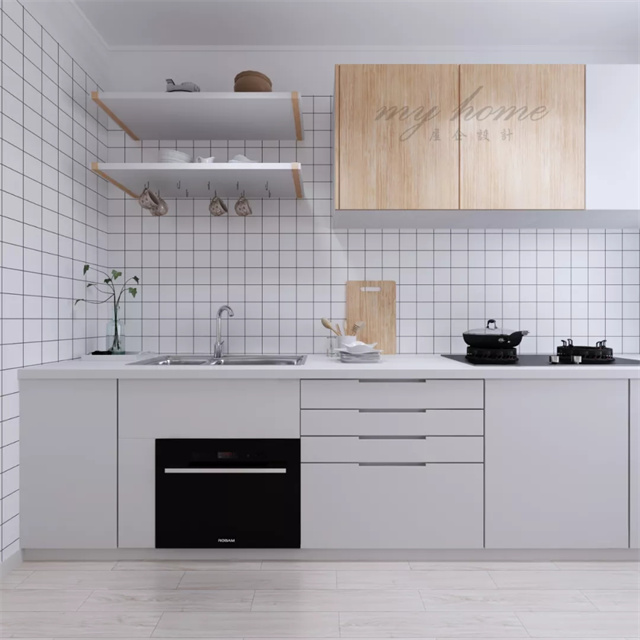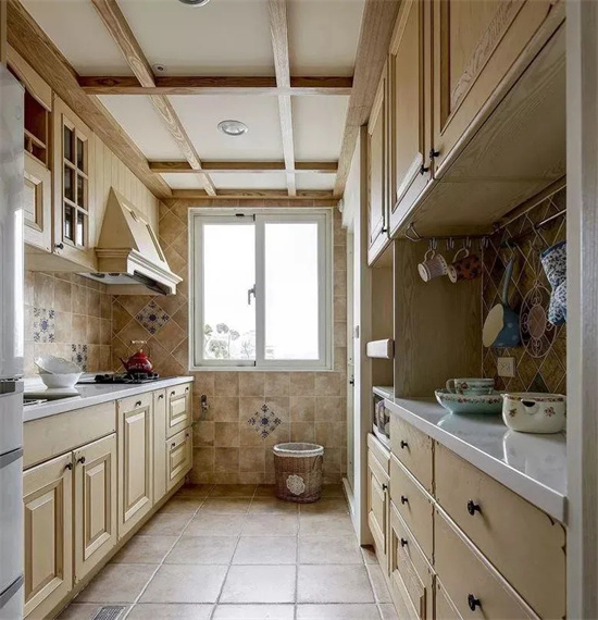 如果家里厨房属于狭长形规格的,可以直接设计成一字型,上下做连排储物柜,将油烟机和燃气灶都做嵌入式设计,整体空间视觉效果更大,更整洁。